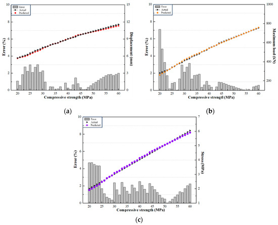 Error between predicted and actual value. (a) Comparison of actual and predicted displacement. (b) Comparison of actual and predicted maximum load. (c) Comparison of actual and predicted stress.