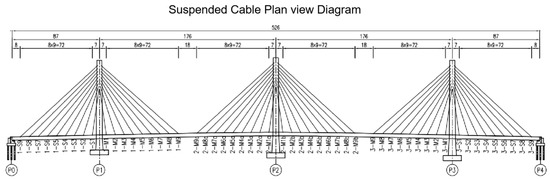 Numerical simulation of cable damage typically encompasses a range of damage conditions, including various damage locations, extents, and multiple damage sites. Both experimental and numerical analysis methods are employed to examine the impact of cable damage locations and the extent of damage quantities on the structure [5]. When a cable sustains damage, the stress in the main girder and the internal forces within the cable are redistributed. The impact of the damage on the structure’s natural frequency is more significant when the damage occurs near the anchorage zone. However, the experiment only considers the effect of the structure’s own weight and does not account for the coupling effects between loads. The damage to the long cables in the side spans significantly affects the static performance of the entire bridge and exhibits a composite characteristic. Damage to other cables primarily affects nearby areas and exhibits regional characteristics [6]. The damage to the back cables and mid-span cables caused by vehicle live loads significantly affects the static structural parameters of the entire bridge, including the alignment of the main girder and the tension forces in the cables. It also significantly affects the dynamic characteristics of the entire bridge [7].
