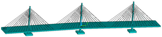 Based on the content, a finite element model of the cable-stayed bridge was established. The coordinate origin is set at the midpoint of the main span, with the x-axis aligned with the transverse direction of the main girder, the y-axis with the longitudinal direction of the main girder, and the z-axis with the vertical direction of the main girder. In this paper, the positive direction of the x-axis is defined as upstream, and the negative direction of the x-axis as downstream. The positive direction of the z-axis is vertically upward. Nodes that are not shared are positioned at the intersection of the tower and girder lines to achieve a floating system with fixed tower–pier connections and separated tower–girder connections. The basic finite element model of the cable-stayed bridge constrains both ends in the z-direction while releasing other degrees of freedom. The lower part of the tower column is fully constrained, and the basic finite element model of the cable-stayed bridge is depicted in Figure 2.