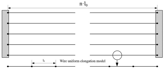 The stay cables are typically composed of high-strength steel wire strands (steel strand bundles) and an external protective system. Internally, the cable usually consists of several individual wires grouped in various configurations. The material discrepancies in steel wires significantly impact their respective strengths, thereby complicating the task of ensuring uniform initial stresses across each wire. Consequently, the tensile force exerted on the cable cannot be uniformly distributed among the individual wires composing the cable. When the tensile force applied to the cable becomes sufficiently large, the steel wire experiencing the maximum stress and the minimum strength within the cable will break first, causing the cable’s tensile load-bearing capacity to begin to diminish [13]. However, in practical research, the differences in the parameters of the steel wires within the cable are often overlooked, and the cable is composed of several parallel bundles of steel wire fibers. Therefore, the strength of the cable can be studied using the fiber bundle strength calculation theory. When applying the fiber bundle strength theory, the cable can be simplified into a series–parallel model [14,15], where the entire cable is considered to be composed of individual steel wires in parallel, and each steel wire is made up of several units connected in series. The strength of the cable is determined by the combined strength of all the steel wires inside it. The actual strength of the cable is directly correlated with the quantity of steel wires it contains, a phenomenon referred to as the Daniels effect [16]. The entire stay cable is considered to be composed of individual steel wires connected in parallel, with each steel wire consisting of several units connected in series, as shown in Figure 3. The strength of the stay cable is determined by all the internal steel wires, and the actual strength of the cable depends on the number of steel wires within it [17].