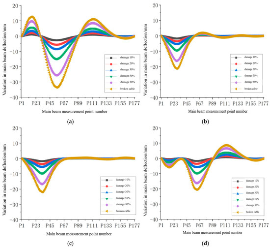 Under different damage levels, the deflection change pattern of the main girder remains consistent. As the degree of damage increases, the magnitude of the deflection change also becomes larger. The peak of deflection variation always occurs near the anchorage point of the damaged cable or at one-third of the span on the same side as the damaged cable.