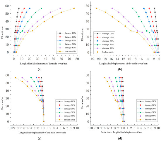 The impact of the four damage scenarios on the displacement of the main tower is shown in Figure 10.