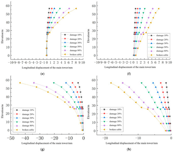 Typical cable damage and the longitudinal displacement change in the main tower. (a) Changes in longitudinal displacements of side towers with different levels of damage from 1-S9; (b) changes in longitudinal displacements of middle towers with different levels of damage from 1-S9; (c) changes in longitudinal displacement of the side towers with different damage levels from 1-S1; (d) changes in longitudinal displacement of the center tower with different damage levels from 1-S1; (e) changes in longitudinal displacement of side towers with different levels of damage in 1-M1; (f) changes in longitudinal displacement of center tower with different levels of damage in 1-M1; (g) changes in longitudinal displacement of the side towers with different levels of damage from 1-M9; (h) changes in longitudinal displacement of the middle tower with different levels of damage from 1-M9.