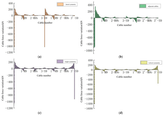 Variation in the cable force for each combination of damage conditions. (a) Change in cable force for transversely symmetrically damaged cables; (b) change in cable force for adjacent cables damaged cables; (c) change in cable force for symmetrical damage at the origin; (d) change in cable force for symmetrical damage in the longitudinal direction.
