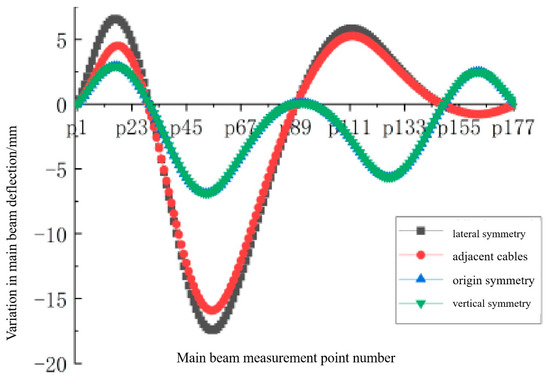 From Figure 6, it can be observed that damage at different locations has varying effects on the alignment of the main girder [11,12,13]. When the long cable 1-S9 in the side span is damaged, the displacement of the main girder is somewhat restricted due to the proximity of the damaged cable to the abutment. At this juncture, as the cable force near the damaged cable intensifies, the nodes of the main girder display an upward deflection trend. On the opposite side of the damaged cable, the cable force diminishes, leading to a downward deflection trend in the main girder. A peak deflection change occurs at the 1/3 span position on the same side as the damaged cable (near the mid-span of the main span). When the long cable 1-M9 in the mid-span is damaged, the nearby nodes of the main girder experience downward deflection, with a peak occurring at the 1/3 span position on the same side as the damaged cable. On the opposite side of the damaged cable, despite the increase in cable tension causing an upward deflection trend at the nodes, the overall nodes still exhibit downward deflection due to the general sinking of the structure. Furthermore, the impact of damage to the long cable in the side span on the deflection of the main girder is more pronounced compared to damage to the long cable in mid-span.