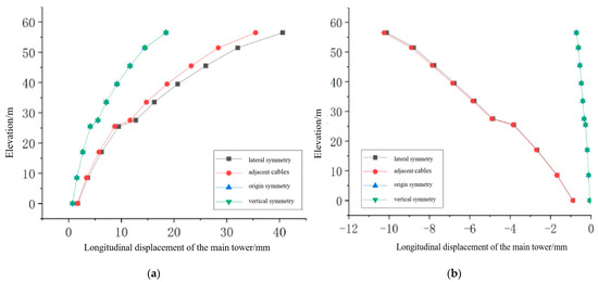 Longitudinal displacement variation in the main tower for each damage condition combination. (a) Change in longitudinal displacement of the side tower for each combination of damage conditions; (b) variation in tower longitudinal displacement for each combination of damage conditions.