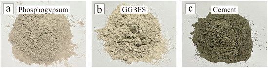 The processing steps are outlined as follows: First, PG undergoes a water washing treatment and is subsequently dried at 40 °C for 48 h. This washing process effectively removes soluble phosphorus and fluorine impurities from the PG. Following the water washing, the PG is mixed with deionized water at a mass ratio of 1:10 and soaked for 1 h. The pH value of the suspension is measured to be 6.8, confirming that the water washing treatment significantly mitigates PG’s adverse effects on the setting time of EPSC. Next, the PG is mixed with GGBFS at a mass ratio of 1:1, and ground in a grinder at a speed of 48 r/min for 5 min. This process culminates in the preparation of the EPSC raw materials.