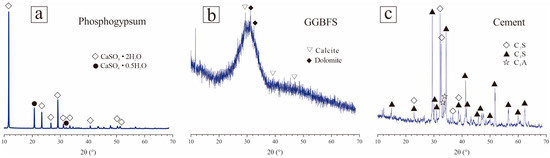 XRD patterns of EPSC raw materials: (a) PG, (b) GGBFS, and (c) cement.
