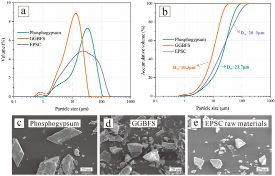 Particle size distributions and SEM of raw materials: (a,b) particle size distributions of PG, GGBFS, and EPSC, and SEM of (c) PG, (d) GGBFS, and (e) EPSC raw materials.