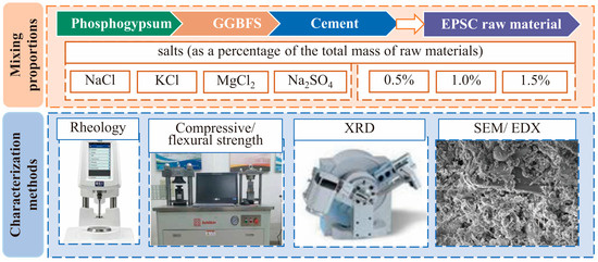 In this study, EPSCs were developed by combining PG, GGBFS, and cement. To assess the influence of various salt types and contents on EPSC, the research examined the effects of different salt (NaCl, MgCl2, KCl, and Na2SO4) contents on the rheological and mechanical properties (compressive strength and flexural strength). Furthermore, the properties and microstructure of both the raw materials and the EPSC were analyzed using X-ray diffraction (XRD) and scanning electron microscopy (SEM) combined with energy-dispersive X-ray spectroscopy (EDX). The objective of this study is to deepen the understanding of how different salts and their contents impact the performance of EPSC.