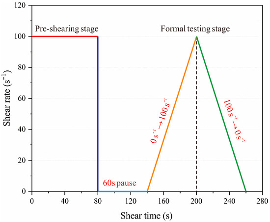 This study utilized the RSX coaxial rotational rheometer to evaluate the rheological properties of EPSC. Prior to formal testing, the EPSC paste underwent a pre-shearing process at a constant shear rate of 100 s−1 for 80 s, followed by a 60 s rest period to ensure uniformity across all samples and establish a consistent initial state. During the formal testing phase, the shear rate was progressively increased from 0 s−1 to 100 s−1 within 0–60 s, then gradually decreased from 100 s−1 to 0 s−1 over the next 60 s, completing the entire testing cycle. The rheological loading mechanism of EPSC throughout the testing process is depicted in Figure 5.