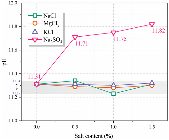 In the alkali-activated GGBFS reaction system, the concentration of OH− ions plays a pivotal role in the hydration process of GGBFS, directly influencing the characteristics of its hydration products [27,28,29]. Research by Song et al. [27] shows that effective hydration of GGBFS necessitates maintaining a pH value above 11.5. When the pH drops below 9.5, the hydration process ceases entirely. A higher pH value not only significantly enhances the efficiency of the GGBFS hydration reaction but also accelerates setting time and improves the resulting mechanical properties. Consequently, investigating the impact of various salts on the pH value of freshly mixed EPSC paste is of substantial research significance.