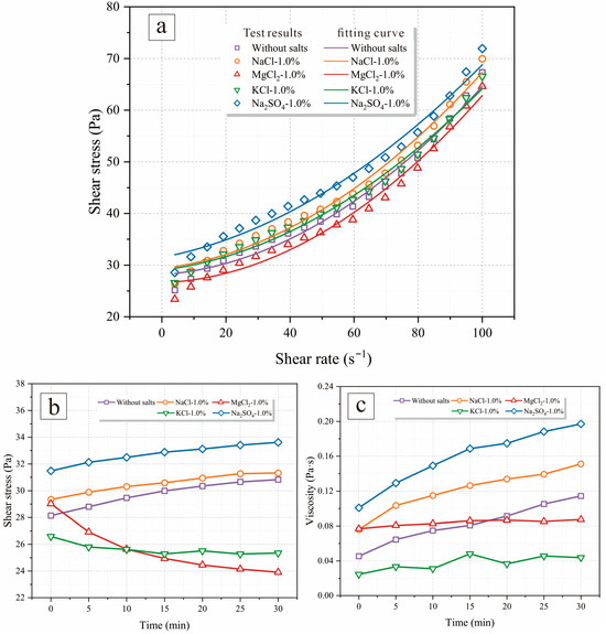 Rheological properties of EPSCs: (a) shear stress as a function of shear rate, (b) shear stress as a function of time, and (c) viscosity as a function of time.