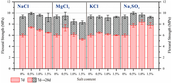 Figure 8 illustrates the impact of different salt types and their concentrations on the 7 days and 28 days flexural strength of EPSC. The results reveal that variations in KCl concentration had a negligible effect on the flexural strength of EPSC. In contrast, the inclusion of NaCl, MgCl2, and Na2SO4 followed a pattern of an initial increase in strength, followed by a decline. Specifically, when the concentrations of NaCl and MgCl2 were 0.5%, the 28 days flexural strength of EPSC increased by 6.32% and 1.39%, respectively. For Na2SO4, the optimal concentration depended on the curing age: a 1% concentration was most effective at 7 days, while a 0.5% concentration yielded the best results at 28 days. Notably, a 0.5% concentration of Na2SO4 significantly enhanced the flexural strength of EPSC, achieving a 28 days flexural strength of 9.96 MPa—representing a 6.7% increase compared to the control group.