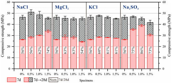 Additionally, Figure 9 illustrates the ratio of 7 days compressive strength to 28 days compressive strength for each group of EPSCs. A higher ratio reflects better early-stage strength development in EPSCs. Without the addition of any salt, this ratio was 56%. As depicted in the figure, the inclusion of MgCl2 and KCl slightly improved this ratio. In contrast, NaCl and Na2SO4 significantly enhanced the early-stage strength development of EPSCs, with the most notable improvement observed when 1% Na2SO4 was added. Under this condition, the 7 days compressive strength reached 86% of the 28 days compressive strength.