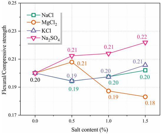 (6) Na2SO4 uniquely elevates the flexural-to-compressive strength ratio (0.19–0.24 vs. 0.18–0.20 for other salts), as needle-like ettringite enhances flexural resistance.