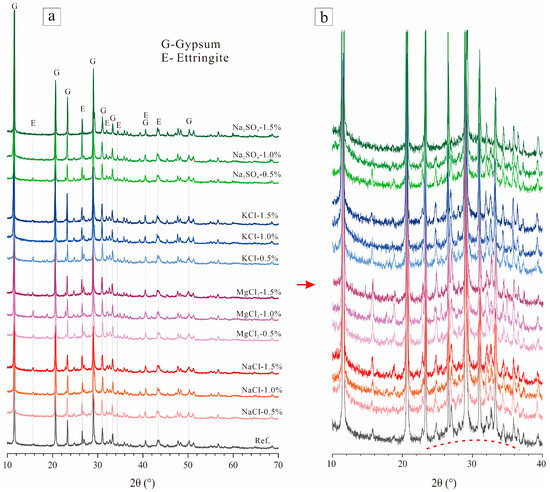 Figure 11 illustrates the comparative analysis of XRD patterns for EPSCs with and without added salt. In the case of EPSCs lacking salt, the predominant crystalline phases are dihydrate gypsum and ettringite. The gypsum phase originates both from the dihydrate gypsum present in PG and the hydration process of hemihydrate gypsum, while ettringite forms during the later stages of hydration as a product of the ongoing reaction between the continuous hydration of GGBFS and gypsum under alkaline conditions [17,18]. A closer examination through local magnification (Figure 11b) reveals a distinct broad hump centered near 30° (2θ) in the XRD pattern of the EPSCs. Compared with the XRD pattern of GGBFS, this broad reflection peak is shifted to a higher angular region, indicating the formation of amorphous C-(A)-S-H gel [20].