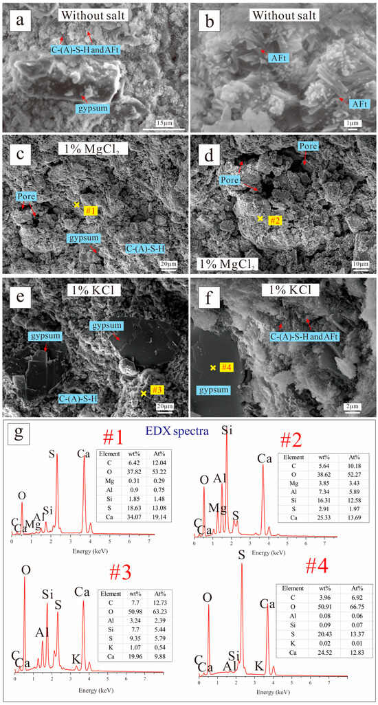 Figure 12c,d depict the surface morphology of EPSC paste containing 1% KCl, which differs from the morphology observed with the addition of MgCl2. However, the variation compared to the group without the salt addition is not significantly pronounced. Upon adding 1% KCl, a trace amount of K was detected in the matrix at point #3. EDX analysis at point #4 (refer to Figure 12g) reveals that the primary elements are Ca, S, and O, confirming that the hydration product is gypsum. The SEM image distinctly highlights the presence of gypsum, which is intricately integrated with C-(A)-S-H, resulting in a dense microstructure. Furthermore, Figure 12d demonstrates that the surface structure is densely packed, with a substantial amount of AFt wrapped and covered by a C-S-H gel layer on the surface.