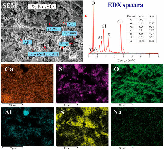 SEM images and EDX elemental mapping of Na2SO4-1.0% after 28 days.