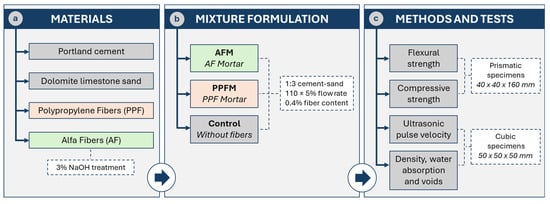 Figure 1 presents an overview of the experimental methodology adopted in this work, structured into three main categories: (a) materials; (b) mixture formulation; and (c) methods and tests. These aspects are explained in detail in the following sections.