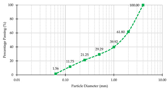 Portland Cement Type I was selected as the cementitious material for the fiber-reinforced mortars, in accordance with the classification outlined by the UNE-EN 197-1 standard [23]. Additionally, the fine aggregate used was a dolomite limestone sand sourced from southern Spain. The particle size distribution, ranging from 0 to 4 mm, is shown in Figure 2.