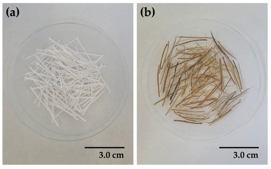 Based on this selection, the alfa fibers underwent alkaline treatment following the methodology proposed by Alcivar-Bastidas et al. [29,30]. The treatment consisted of soaking the AF in a 3% NaOH solution (prepared with deionized water) for 4 h, followed by soaking in common water for 10 h. Next, they were washed and rinsed, to conclude the procedure by oven-drying the fibers at 85 °C for 24 h. The treated fibers were subsequently cut to 3.0 cm using a manual procedure developed in the laboratory, in accordance with the results reported by Alcivar-Bastidas et al. [30], and to match the length of the PPF, thereby enabling more consistent comparative conditions. The final appearance of AF is shown in Figure 3b.