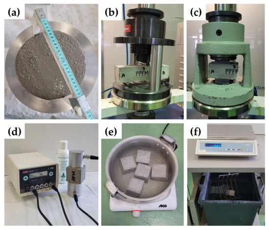 Procedures and tests conducted in the experimental program: (a) flow rate in fresh state; (b) flexural strength test; (c) compressive strength test; (d) UPV test; (e) boiling procedure of specimens; and (f) weighing specimen suspended in water.