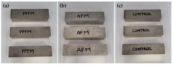 Visual aspect of prismatic 40 × 40 × 160 mm specimens: (a) PPFM; (b) AFM; and (c) CONTROL.