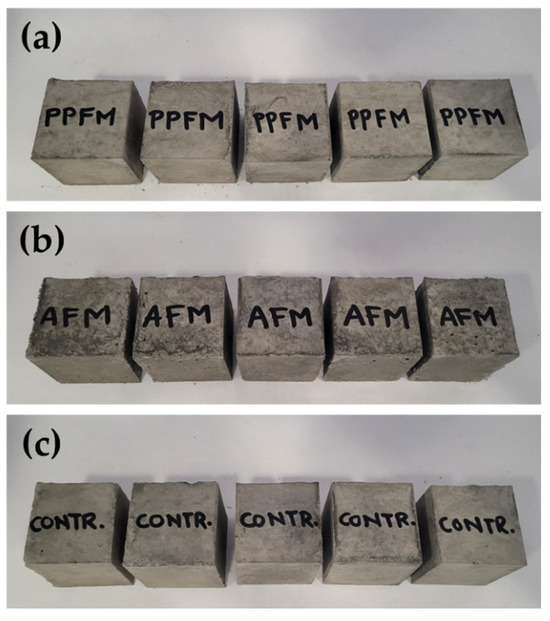 Visual aspect of 50 mm cubic specimens: (a) PPFM; (b) AFM; and (c) CONTROL.