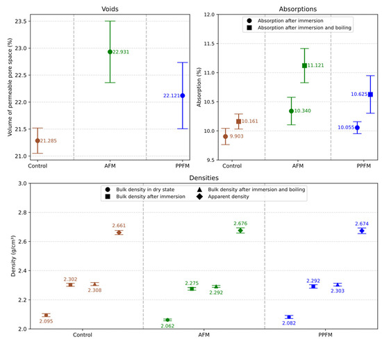 Figure 7 presents the basic physical properties of the evaluated mortars (i.e., CONTROL, AFM and PPFM) in terms of void content, water absorption and density, highlighting the influence of the incorporated fibers. The modified mortars, particularly the one reinforced with synthetic fibers (i.e., PPFM), exhibit notably higher volumes of permeable pore space and increased absorption values, indicating a greater water retention capacity. Conversely, the incorporation of fibers shows minimal impact on both densities, likely due to the relatively low fiber dosage employed in the mixes, which was insufficient to (significantly) alter the mass-to-volume ratio of the mortars.