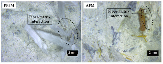 Additionally, Figure 8 presents microscopic visualization of the PPFM and AFM specimens, providing insights into the interfacial transition zone between fibers and the cementitious matrix. These images offer qualitative information regarding fiber dispersion, surface adhesion and the integrity of the cement paste. While the images suggest adequate fiber–matrix interaction that may contribute to the mechanical performance, they also reveal minor voids and interfacial gap dispersion, which likely explain the observed minor increase in porosity, when compared to the fiber-reinforced mortars with the CONTROL mixture.