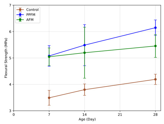 Figure 9 shows the variation in FS of the three evaluated cement mortar mixtures (i.e., CONTROL, AFM and PPFM) measured at curing ages of 7, 14 and 28 days. The reference mixture, represented in brown, consistently exhibits the lowest flexural strength across all curing periods, starting at approximately 3.5 MPa on day 7 and gradually increasing to almost 4.2 MPa by day 28. In contrast, both fiber-reinforced mortars show significantly improved performances. The AFM mixture, shown in green, starts at around 5.0 MPa and sees a modest increase over time, reaching approximately 5.5 MPa at 28 days. The most notable improvement is observed in the PPFM mixture, represented in blue, which begins with a flexural strength of about 5.1 MPa on day 7 and continues to increase more sharply than the others, reaching over 6.1 MPa by day 28. Although both fiber-reinforced mixtures outperform the CONTROL one, the overlapping error bars between AFM and PPFM at each curing age suggest that the differences in flexural strength between the two fiber types are not statistically significant. The preceding indicates that although polypropylene fiber shows a slightly higher average performance, both fiber additions offer comparable enhancements within the observed variability.