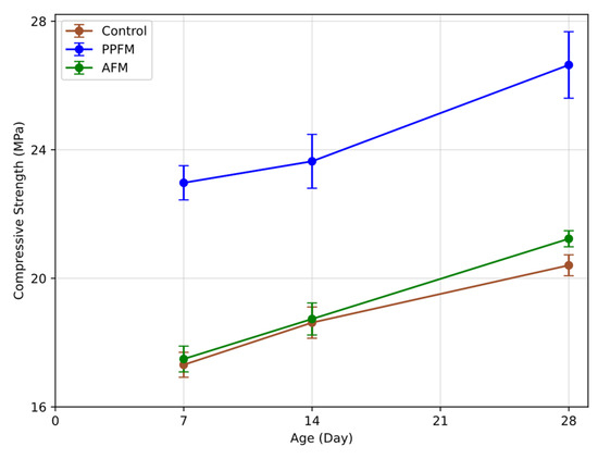 Figure 11 presents the evolution of CS in the three evaluated cement mortar mixtures (i.e., CONTROL in brown, AFM in green and PPFM in blue) measured at curing ages of 7, 14 and 28 days. All mixtures exhibit a progressive increase in strength with curing time, reflecting continued hydration and matrix densification. The CONTROL mixture starts at around 17.3 MPa on day 7 and reaches just above 20.4 MPa by day 28. The AF-modified mortar slightly improves over the CONTROL at each stage, achieving approximately 21.2 MPa by day 28, suggesting a modest contribution of natural fibers to compressive behavior. In contrast, the PPFM mixture consistently demonstrates the highest compressive strength, starting near 23.0 MPa on day 7 and rising to approximately 26.6 MPa on day 28. This superior performance indicates that polypropylene fibers provide a more effective reinforcement mechanism under compressive loading, likely due to better bonding and stress distribution.