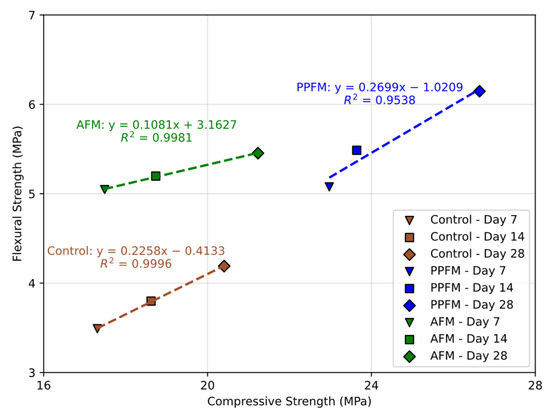 A final analysis of the flexural and compressive strengths is presented in Figure 12. This plot illustrates the correlations between FS and CS for each of the three evaluated cement mortars. According to Figure 12, a clear positive correlation exists in all mixtures, with high coefficients of determination (R2 > 0.95). This strong relationship ensures the reliability of the results and indicates that an increase in one typically corresponds to an augment in the other. These results align well with findings reported in the literature, confirming expected behavior [2,58,59].