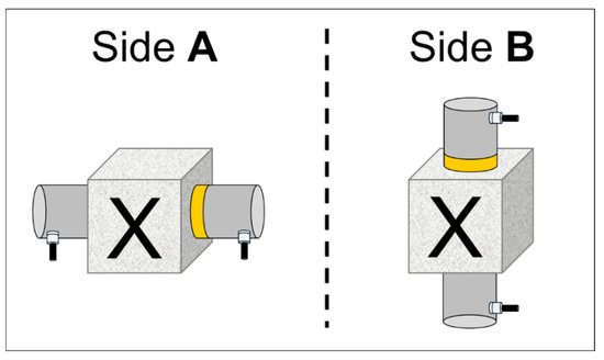 In line with the ASTM C597-22 [45], UPV tests were performed at 7, 14 and 28 days of curing, using five different cubic specimens of 50 mm per mortar to ensure reliability. For this purpose, the direct method was adopted by means of a UPV Tester Model 58-E0048 by CONTROLS, with a frequency of 54 kHz. The emitter was placed opposite the receiver in the cube, considering two different sides (designated as side A and side B), discarding the top face of each specimen. The measurements were conducted on the lateral faces in contact with the mold, as these sides exhibited a uniform and smoother surface compared to the top and bottom faces of the specimens, which, for the purposes of this study, were excluded due to potential surface irregularities Additionally, to promote an effective pulse transmission between the transducers and the mortar, a transonic gel was utilized (see Figure 4d).