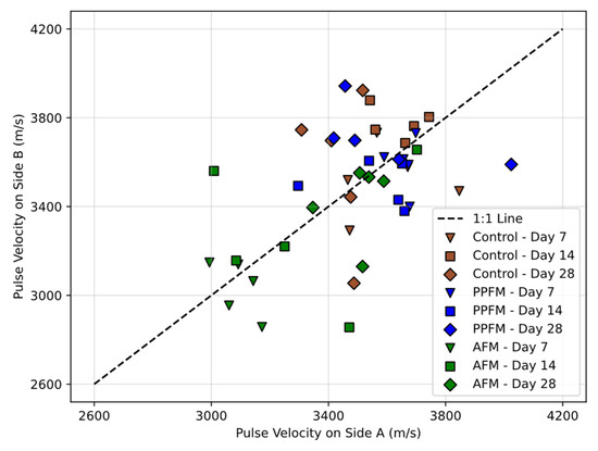 Figure 14 shows the UPV measurements taken along two orthogonal directions (i.e., Side A and Side B according to Figure 13) for the three types of evaluated cement mortars (i.e., unreinforced reference mixture with brown markers, AFM with green markers and PPFM with blue markers), each tested at curing ages of 7, 14 and 28 days. Figure 14 also includes a dashed 1:1 reference line, representing the ideal case where the pulse velocity measured on Side A is equal to that on Side B, indicating perfectly isotropic behavior, where material properties are the same in all directions. In this context, the closer an experimental data point lies to the 1:1 line, the more similar the wave velocities are in both directions, suggesting that the material behaves isotropically. Conversely, the farther a data point deviates from the 1:1 line, the greater the difference in wave velocities between the two directions, indicating a higher degree of anisotropy. This visual comparison provides a straightforward way to assess the directional dependence of the material’s internal structure and mechanical response. Overall, the widespread scattering of data points around this line across all mixtures and curing ages reveals notable discrepancies between pulse velocities on different sides of the specimens. This directional dependency in wave propagation clearly indicates that all mixtures exhibit anisotropic behavior. The results highlight that the intrinsic structure of fiber-reinforced and plain cement mortars significantly influences measurement direction on UPV values, confirming that cementitious materials inherently possess anisotropic characteristics.