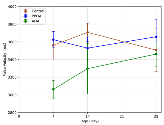 Figure 15 shows the UPV results for each type of cement mortar at different curing ages, with values averaged between both measurement sides. This graph reveals that the CONTROL and PPFM mixtures exhibit overlapping error bars across all ages, suggesting that including PPF did not significantly alter the pulse velocity compared to the unmodified mortar. Furthermore, both these mixtures show minimal variation over time, with no distinct increasing or decreasing trend, implying a relatively stable internal structure during curing. Conversely, the AFM mixture demonstrates consistently lower pulse velocity values at early ages, followed by a steady increase up to day 28, eventually approaching the values of the CONTROL one. This progressive increase in pulse velocity for AFM may indicate gradual densification or refinement of the internal microstructure. The initially low UPV could reflect higher porosity or microcracking introduced by the modification, while the subsequent improvement suggests “healing” or structural refinement, highlighting a different temporal development in the internal structure compared to the other mixtures. From a construction perspective, these results imply that AFM may not be suitable for applications requiring early-age strength or rapid formwork removal. Nonetheless, its improving performance over time denotes potential for use in non-urgent structural elements or contexts where long-term durability is prioritized over early strength.