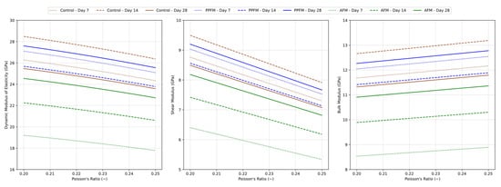The ASTM C597-22 standard recommends determining the stiffness of the cement-based materials through the UPV test by employing Equation (1). This expression allows the calculus of the Dynamic Modulus of Elasticity (). Accordingly, mortar concrete is assumed to be a perfectly elastic material. In that case, it is also possible to compute the Shear Modulus (G) and Bulk Modulus (K) via Equation (2) and Equation (3), respectively [74].
