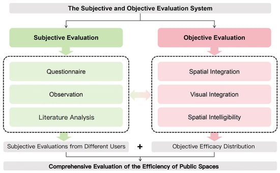 The present study aims to develop a comprehensive evaluation system for assessing the efficiency of public spaces within university building complexes. In addressing the limitations of existing studies that predominantly focus on single-perspective evaluations, this paper attempts to establish a space evaluation method integrating both subjective and objective approaches. The study employs the Center for Balance Architecture at Zhejiang University (BAC) as a case study for in-depth analysis. A mixed-method approach combining spatial syntax and subjective questionnaires is adopted in this research. Through the use of DepthmapX simulation (https://www.spacesyntax.online/software-and-manuals/, accessed on 10 June 2025), the study analyzes pre- and post-renovation metrics, such as spatial integration, visual integration, and spatial intelligibility. Coupled with user satisfaction evaluations, the assessment evaluates the efficiency of public spaces. This not only validates the design’s rationality but also provides practical guidelines for future campus architectural design and renovation efforts.