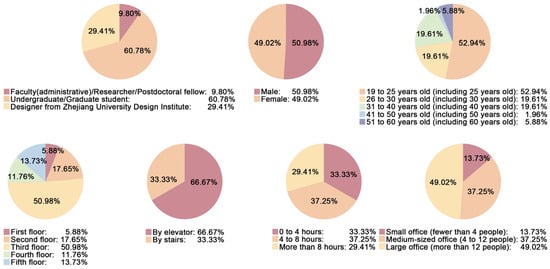 A total of approximately 200 individuals regularly use the renovated building, with the questionnaire survey targeting 20% to 50% of this population []. Sixty questionnaires were distributed and, after eliminating invalid responses, 51 valid samples were collected. As Figure 2 shows, the user composition of the public space primarily consisted of faculty members, students (both undergraduate and postgraduate), and designers from the Design Institute, with the student population accounting for 60% of the total. The gender ratio was balanced (1:1), and the age distribution was concentrated between 19 and 40 years (80%). Spatially, users’ working and learning locations were mainly distributed on the third floor (50%), while the remaining floors (2nd, 4th, and 5th) showed a relatively even distribution. Notably, the first floor exhibited relatively low actual usage, despite its strong public attributes. Regarding transportation mode selection, approximately 67% of respondents preferred using elevators. The duration of space usage demonstrated a uniform distribution pattern: user groups spending less than 4 h, 4–8 h, and over 8 h each accounted for approximately one-third of the total. In terms of office space typology, categorized as small (≤4 persons), medium (4–12 persons), and large (>12 persons) offices, users of large offices constituted 50% of the total.
