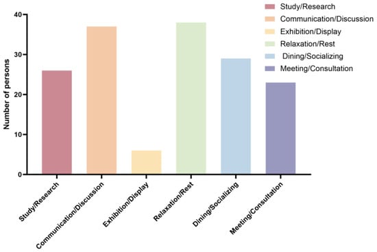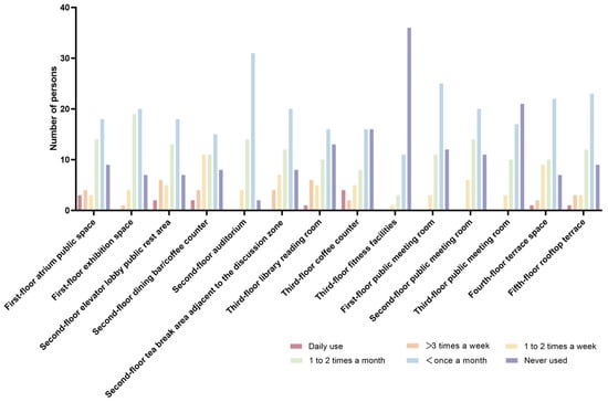 Figure 3 and Figure 4 demonstrate that users of public spaces exhibited a stronger preference for discussion/exchange areas and resting zones, followed by learning/research spaces, dining/socializing areas, and meeting rooms. In contrast, exhibition spaces attracted the least engagement, accounting for only 5% of usage. Regarding frequency, users showed limited utilization of the centrally central public spaces, with most individuals accessing each public space no more than once or twice per month. Notably, the third-floor fitness facilities registered the lowest usage frequency, with over 60% of respondents reporting never having used this public space.