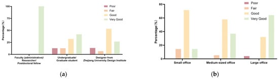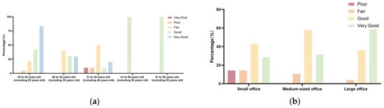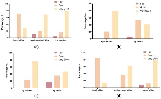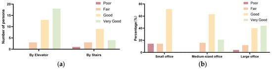 Notably, significant differences were observed in two key areas: the effect of different arrival methods on visual permeability between floors (p = 0.031, Table 4) and the influence of varying usage space scales on the sense of direction within the internal space (p = 0.042, Table 4). As illustrated in Figure 4, users who accessed office or study areas via stairs reported lower satisfaction with inter-floor visual permeability compared to those using elevators (Figure 5a). Furthermore, the majority of users in large offices (>12 people) expressed satisfaction with the sense of direction within public spaces, rating it between “good” and “very good” (Figure 5b). In contrast, users in medium and small offices reported lower satisfaction with their internal sense of direction in public spaces, with some users in small offices specifically indicating “poor” and “average” ratings.