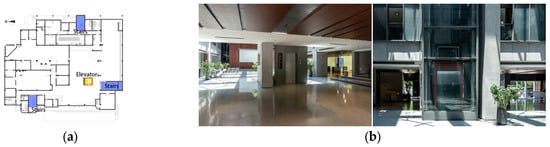 Survey results on spatial accessibility: (a) stairs and elevators in the floor plan; and (b) the transparent elevator located at the entrance transportation center.