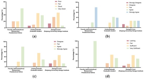 Survey results on spatial accessibility: (a) evaluation of the convenience of the wayfinding system by users with different identities; (b) evaluation of satisfaction with the cultural attributes of public spaces by users with different identities; (c) evaluation of satisfaction with the decorative style of public spaces by users of different identities; and (d) evaluation of the sufficiency of public seating and gathering areas by users with different identities.