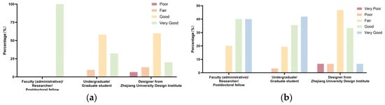 Survey results on the satisfaction of nodal spaces: (a) evaluation of space for study and research by users with different identities; and (b) evaluation of space for dining and social by users with different identities.
