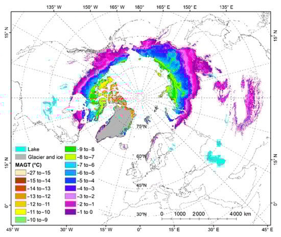 The durability of soft soil is significantly influenced by a range of external forces and long-term environmental factors that alter its physical and mechanical properties [1,2,3]. Such alterations destabilize the internal structure of the soil, leading to a decrease in bearing capacity and stability, which is especially critical in building engineering. Many seasonally frozen regions (e.g., in China, Russia, and Canada) in the Northern Hemisphere exhibit a mean annual ground temperature (MAGT) below 0 °C (as shown in Figure 1). In such regions, winter subzero temperatures trigger soil freezing, followed by summer thawing. Repeated freeze-thaw cycles are a major factor contributing to soil degradation, progressively weakening its mechanical properties over time [4,5,6]. The volume expansion and contraction of soil, combined with water migration during freeze-thaw cycles, leads to a significant reduction in the strength and stiffness of soft soil [7,8]. This degradation threatens the long-term safety of infrastructure, particularly roads, airport runways, and bridge foundations, which are highly susceptible to freeze-thaw damage [9,10]. Therefore, understanding the behavior of soft soil under freeze-thaw conditions is essential for the design, maintenance, and enhancement of infrastructure in cold regions [11].