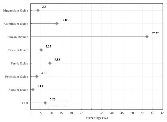 The soft soil used in this study was sourced from the East China coast. Its primary physical properties (e.g., natural moisture content, plastic limit, liquid limit, etc.) are shown in Figure 2. Figure 3 provides detailed chemical composition data obtained through X-ray fluorescence (XRF) analysis. The soft soil samples were prepared from remold soil with a 50% moisture content (as shown in Figure 1). Initially, the soft soil was dried in an oven at 105 °C for 24 h to remove all moisture. After drying, the soft soil was crushed and sieved using a 2.0 mm square-hole sieve. The particles that passed through the 2 mm sieve were used to prepare the remolded soil by adding a specified amount of water to match the natural moisture content of the in situ soft soil, as described by Min et al. [34].