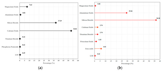 Chemical composition from XRF analysis: (a) slag; (b) FA.