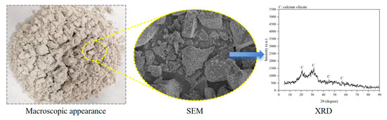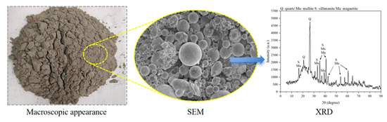 Alkali-activated cementitious materials (ACMs) consist primarily of alkali-activated aluminosilicate substances. In this study, slag and fly ash (FA) were used as the main raw materials to prepare the precursor of ACM. Slag, a solid white powder, was obtained from a steel factory in Suqian, China, while FA, a solid black powder classified as F-class by ASTM C618 standard [35], was sourced from a coal power plant in Jiangyin, China. The particle size distribution of slag and FA is shown in Figure 4. The chemical compositions of slag and FA, analyzed by X-ray fluorescence (XRF) analysis, are detailed in Figure 5, respectively. Figure 6 and Figure 7 also display the micromorphology and mineral phases of slag and FA, as analyzed by scanning electron microscopy (SEM) and X-ray diffraction (XRD), respectively. It should be noted that the chemical and mineralogical characteristics of slag and FA can vary significantly by region due to differences in industrial processing (e.g., steel production methods, coal combustion types). Such variability may affect the reactivity and performance of alkali-activated materials. To accommodate local raw material differences and maintain consistent mechanical and durability performance, supplementary pozzolanic materials such as silica fume or metakaolin can be incorporated based on XRF results to compensate for insufficient reactive components (e.g., CaO, SiO2, or Al2O3). As the alkali activator for this study, commercially available solid NaOH flakes with a purity of 99% were employed.