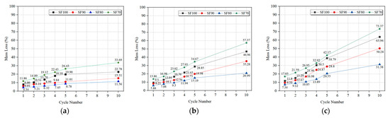 The mass loss curves for OP-ASF stabilized soft soil with different ratios of slag to fly ash (SF100, SF90, SF80, and SF70) were shown in Figure 9a–c. The mass loss curves of all ratios exhibited similar trends under varying freeze-thaw cycles. However, the final mass losses varied depending on the ratio of slag to FA. At the same freezing temperature and number, the stabilized soft soil sample SF80 had the lowest final mass loss, whereas the sample SF70 had the highest. Specifically, the final mass losses of the OP-ASF stabilized soft soil sample SF80 at various temperatures were 11.56%, 20.99%, and 31.38% for −5 °C, −10 °C, and −20 °C, respectively. On the other hand, the stabilized soft soil sample SF70 consistently showed a final mass loss of 30% at each freezing temperature. The results highlighted that the presence of a higher slag content led to gentler slopes in the mass loss curves, suggesting that higher slag ratios favor the reduction of mass loss. This was likely due to the increased formation of alkali-activated gels that contribute to improved bonding and reduced cohesion loss during freeze-thaw cycles. In contrast, when the proportion of fly ash increased excessively, it introduced more pores and cracks, allowing a larger volume of water within the soil to freeze. As the water froze and expanded, it resulted in the disruption of the soil structure, causing a sharper increase in mass loss, especially in SF70.